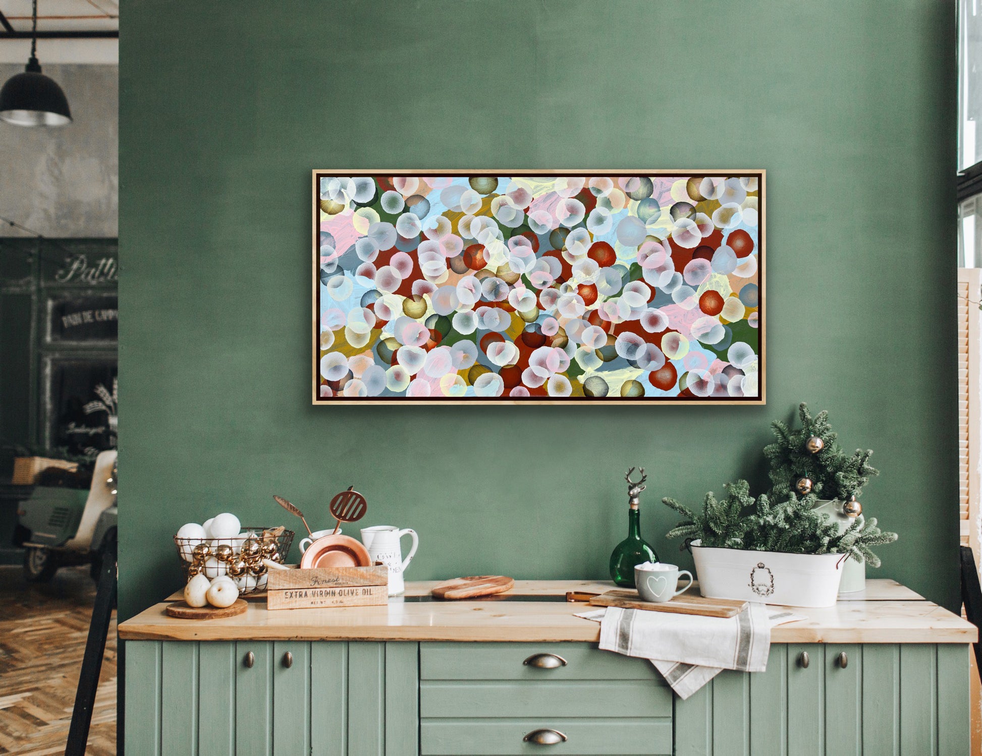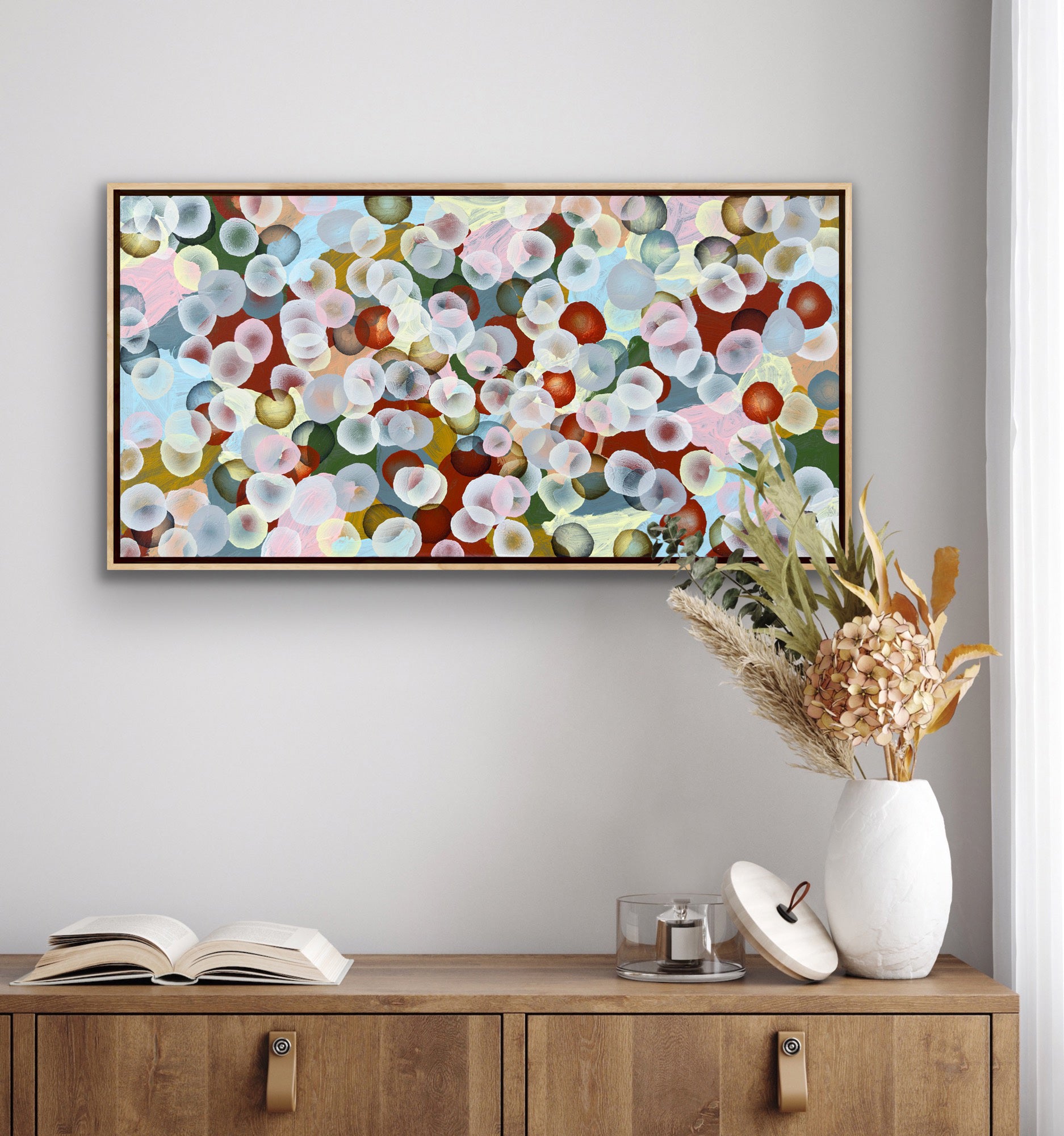 This is an original, one off, colourful abstract painting on canvas and framed ready to hang on your beautiful wall.