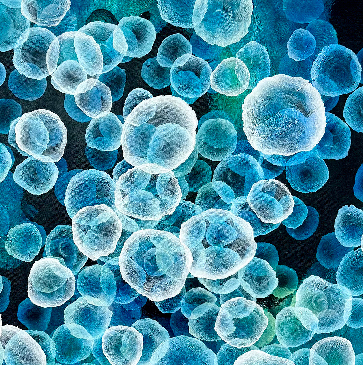 The big. The tiny. The sea. The molecules. The microscopic. These things I think about and look at when I create these paintings. They can be viewed as miniscule cell life just as easily as floating jelly-fish swarms or an underwater garden with bioluminescent organisms and sea anemones blooms.