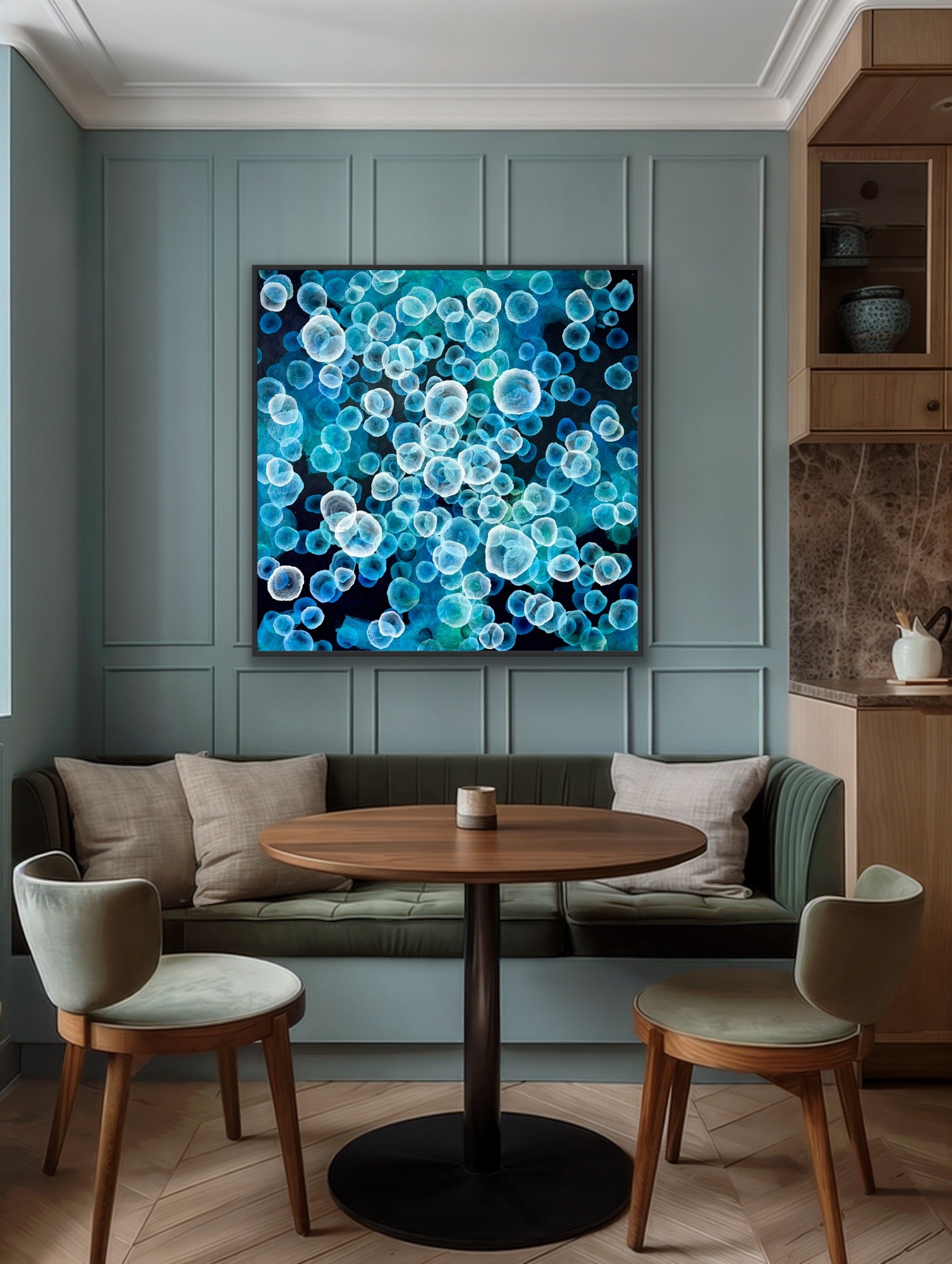 Diving deep into the big blue. This painting belongs to my 'Aquatic' Series. It is representative of my exploration into the microscopic minutiae of life with all its order & chaos. I delve into the beautiful parallels of art with science that I have bound with my love of floaty effervescent underwater life. All the stuff that is so very real but cannot be seen with our normal everyday eyesight.